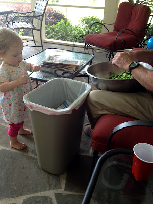 The beans came from a neighbor's garden. Daddy-O said he would snap them if I would cook them and asked Baby Sister if she wanted to help. She watched him carefully and then did her share.