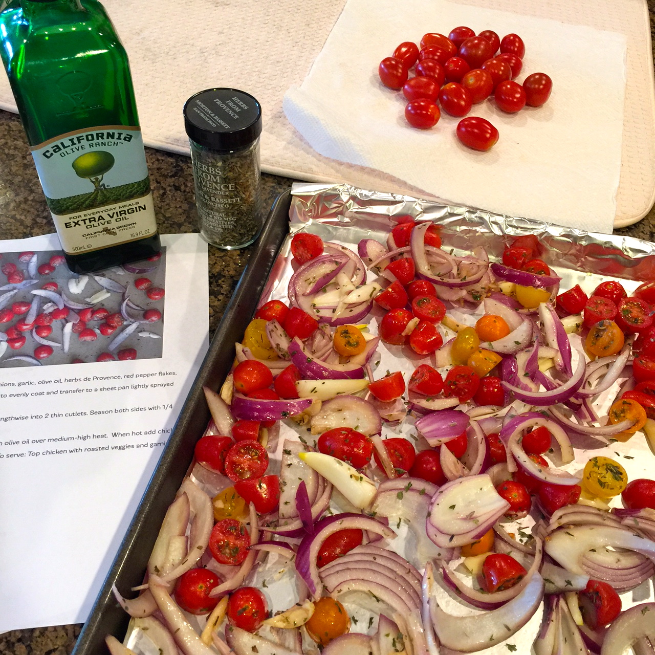 Combine tomatoes, onions, garlic, olive oil, herbs de Provence and salt & pepper in a medium bowl. Stir to coat veggies. Spread onto a lightly oiled sheet pan. Roast at 400 degrees for 20 minutes, or until tomatoes have softened and onion is a little brown.