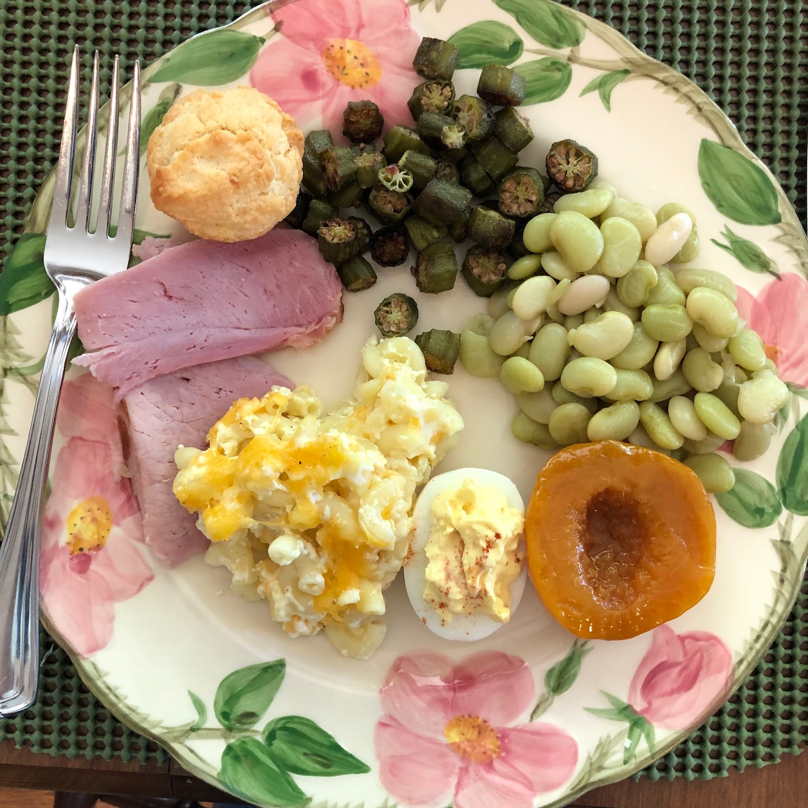 The biggest meal was a traditional southern Sunday dinner. I haven't cooked like this in ages. I baked the ham and used the brown sugar-mustard glaze we like. I also made macaroni and cheese,roasted okra(the okra was from our garden) and sour cream muffins. Baby limas, deviled eggs and pickled peaches completed the plate.