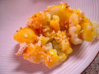 Cut cauliflower into flowerettes (that means smaller pieces) and place into a microwave-safe dish. Sprinkle a little water over it (probably about a tablespoon if you need a measurement.) Cover and cook on HIGH for 4-5 minutes until tender-crisp.